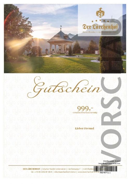 Mit unseren Gutscheinvorlagen erstellen Sie hochwertige Wertgutscheine in beliebiger Höhe. Selbstverständlich können Sie Ihren Gutschein mit einer individuellen Grußbotschaft noch persönlicher gestalten.